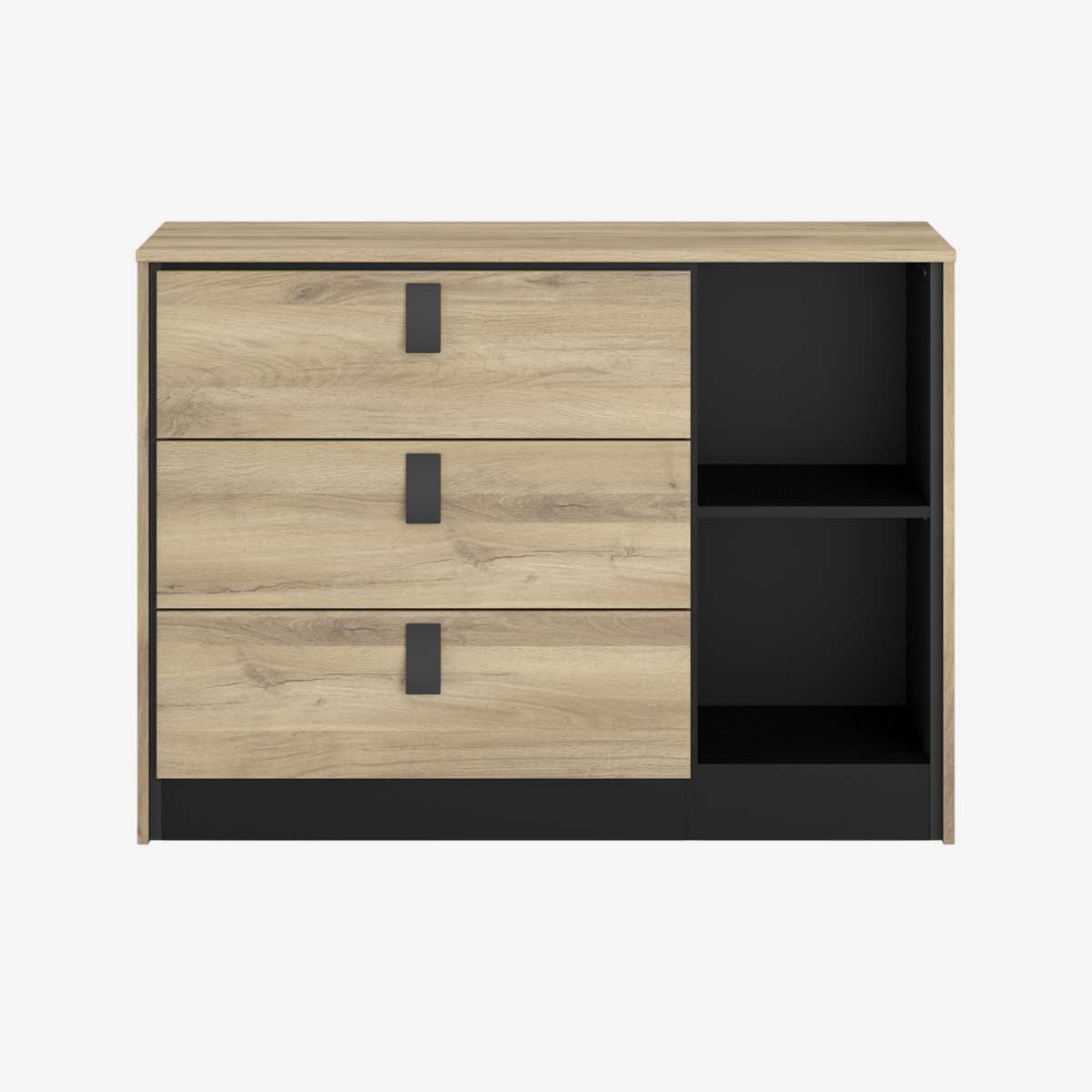 Fonctionnelle et esthétique, la commode PAVANA est idéale pour structurer l’espace de la chambre. Elle dispose de trois tiroirs spacieux pour le linge et les vêtements, complétés par deux niches ouvertes permettant de garder les objets du quotidien à portée de main ou de mettre en valeur des éléments décoratifs.
