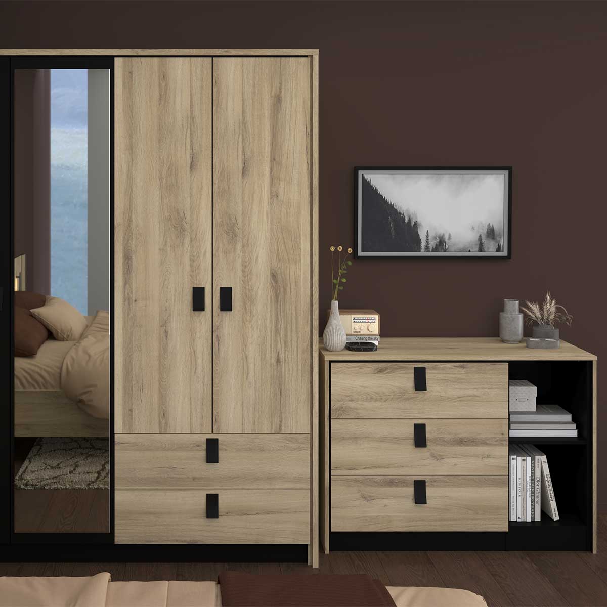 Sa finition chêne Kronberg associée au noir apporte une touche moderne et graphique, facile à intégrer dans différents styles d’intérieurs. Conçue en panneaux de particules, cette commode assure stabilité et robustesse pour un usage quotidien, tout en s’harmonisant parfaitement avec les autres meubles de la gamme PAVANA.
