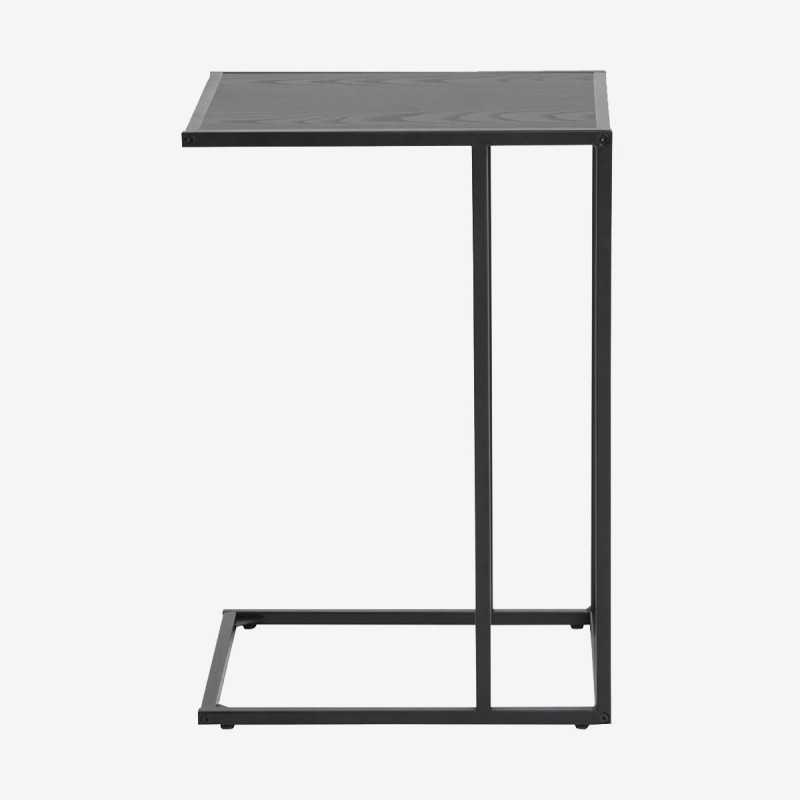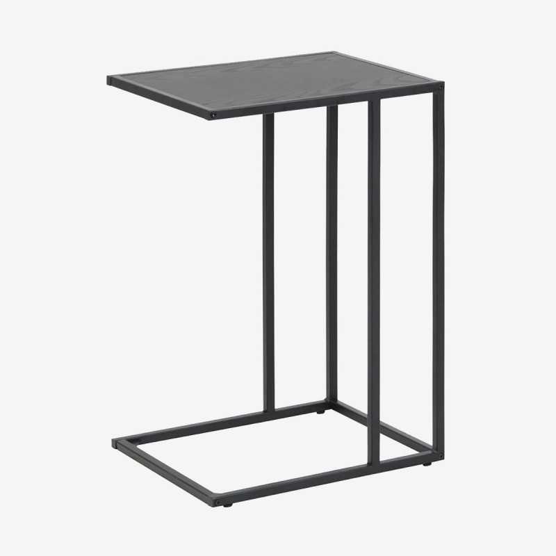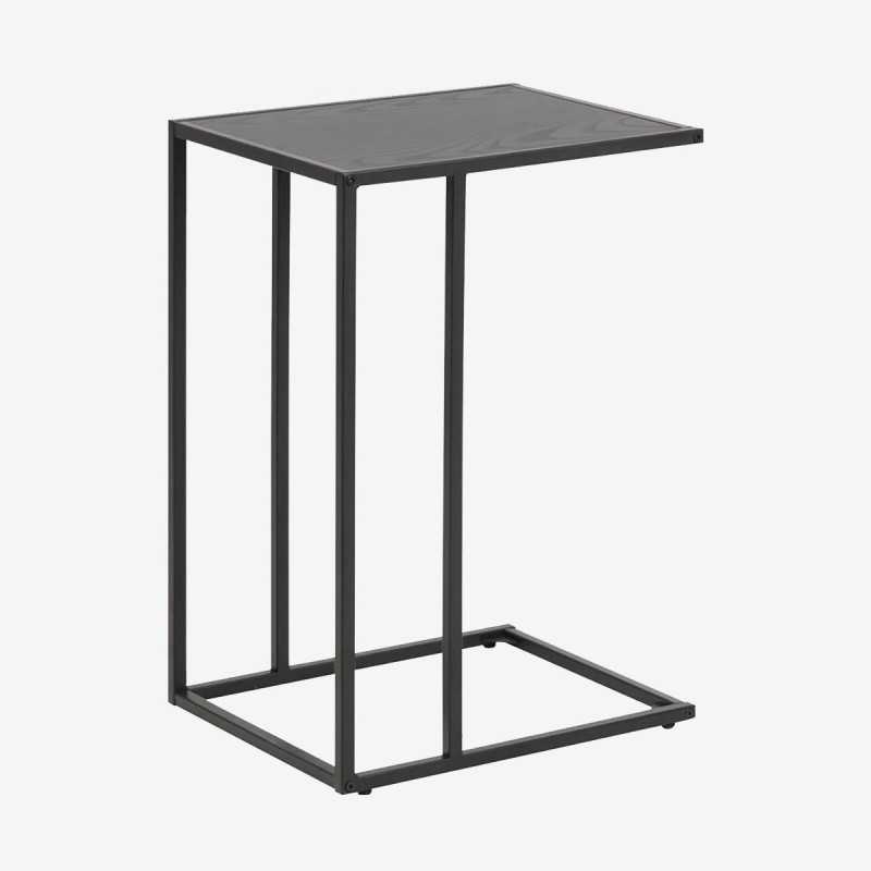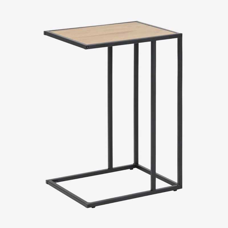 Bout de canapé ALIBA pour ordinateur portable avec plateau en panneau de particules recouvert de papier déco. Pieds en métal enduit de poudre brute noir mat