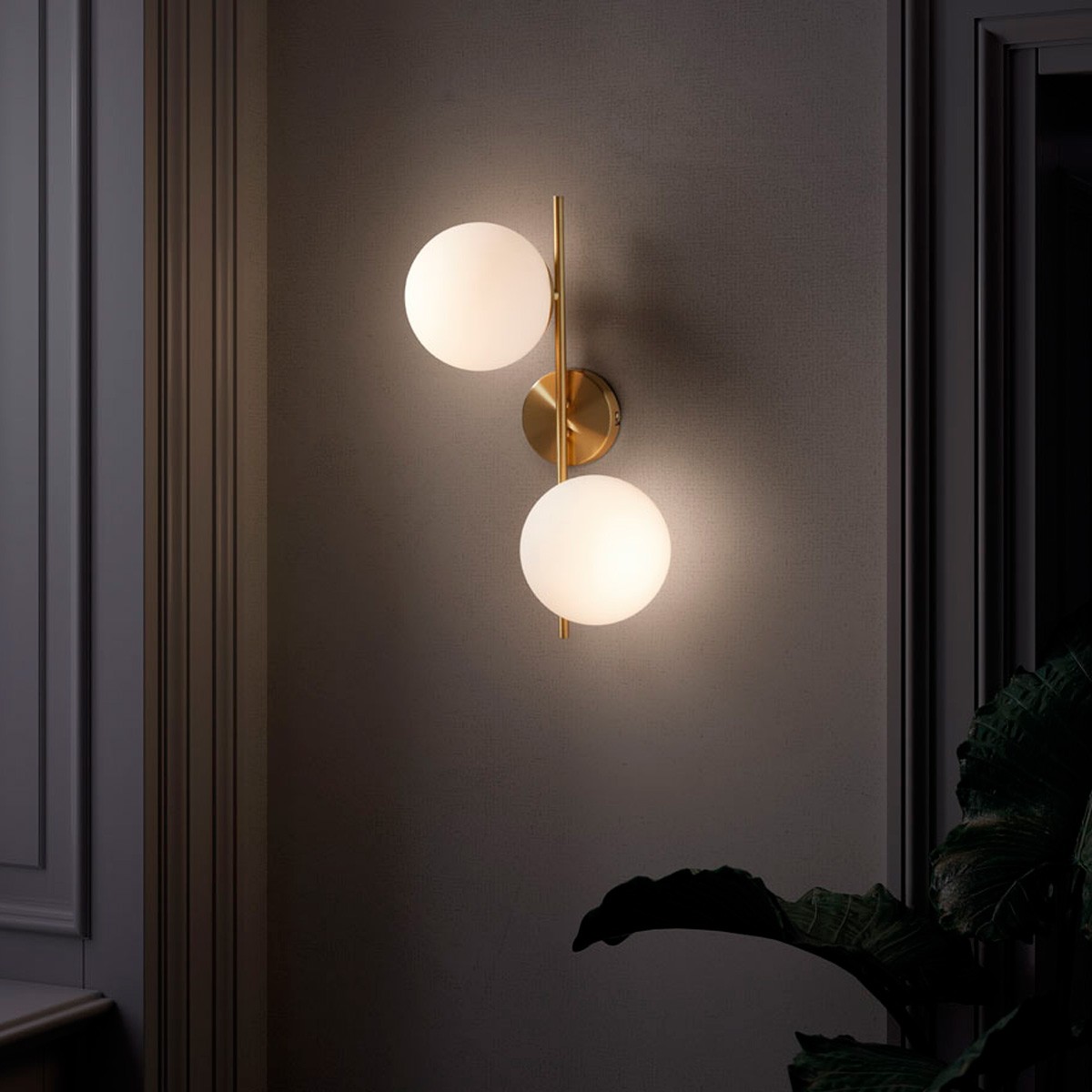 Métal et sphère en verre blanc. Nécessite deux ampoules E27 non fournies