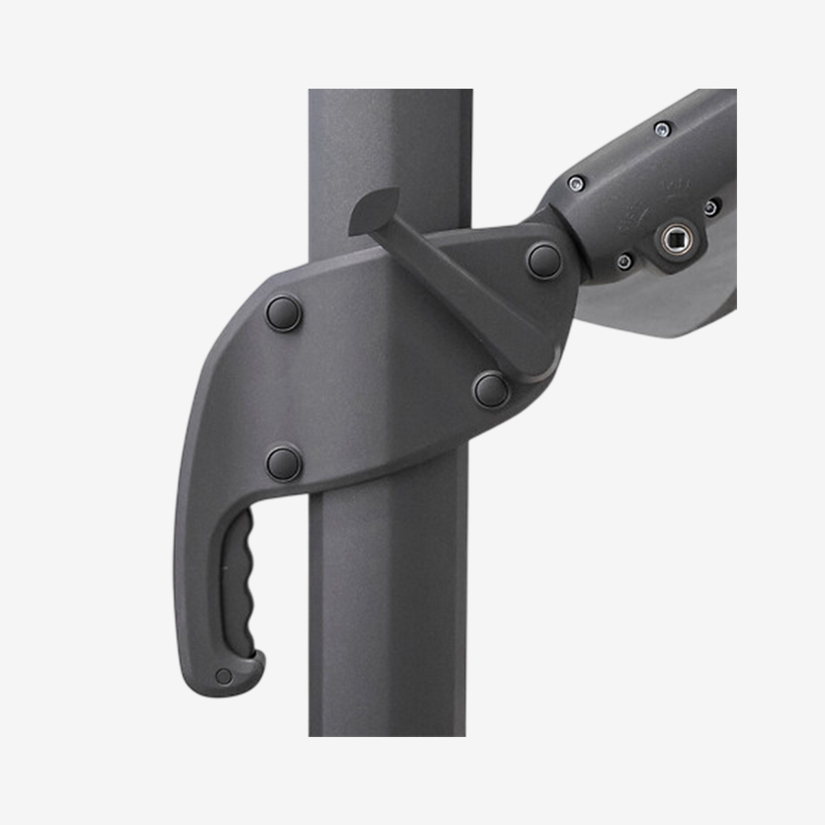 Conçu pour s’adapter à l’ensoleillement, il dispose d’un système d’inclinaison, d’une crémaillère pour le réglage en hauteur et d’une rotation 360°. L’ouverture se fait simplement grâce à une manivelle, pratique au quotidien.