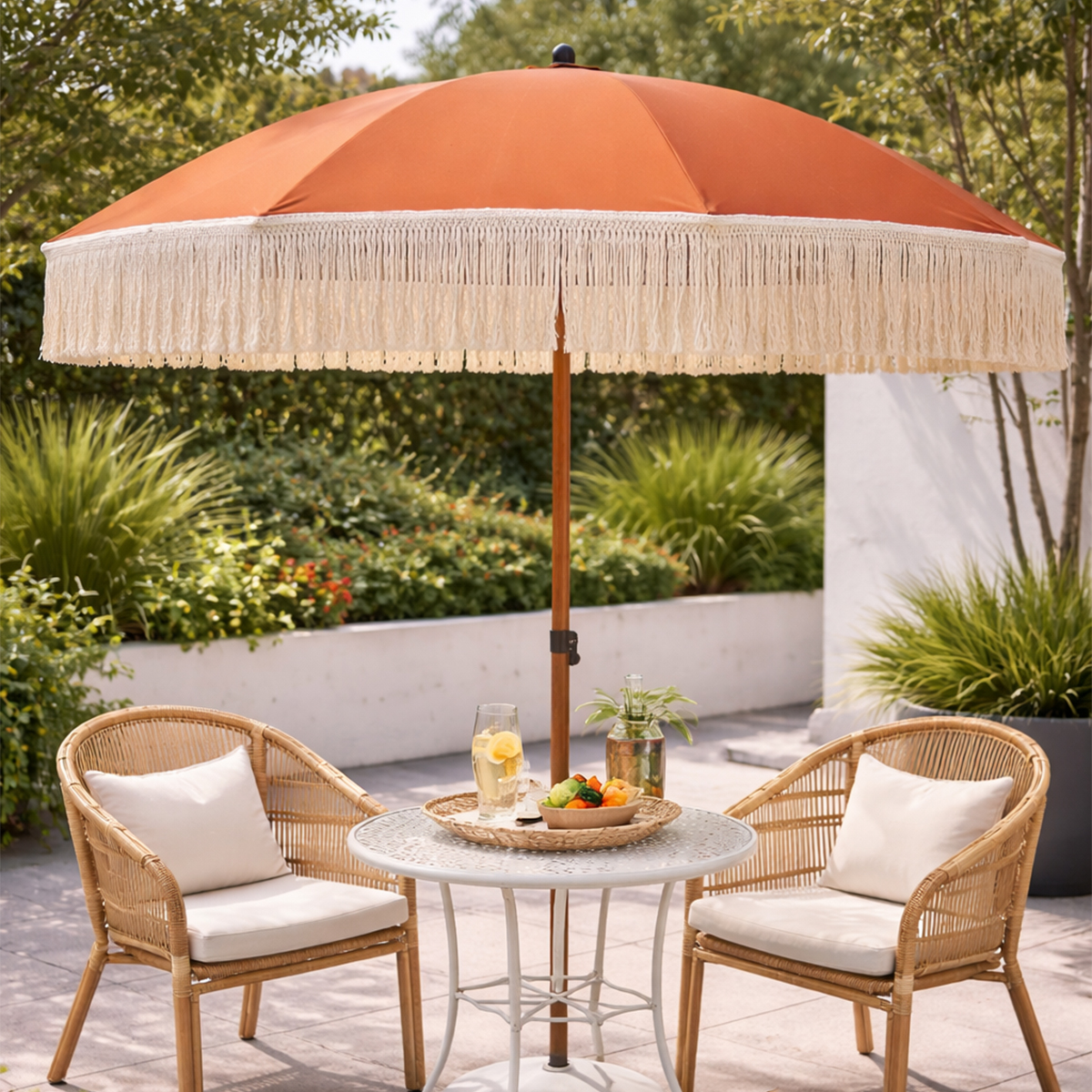 Avec ses franges élégantes et son coloris terracotta, le parasol KILIOS apporte une note chaleureuse et tendance à vos espaces extérieurs. Son design soigné en fait un véritable élément de décoration pour ombrager avec style un coin détente, une terrasse ou un balcon.
