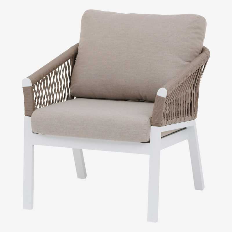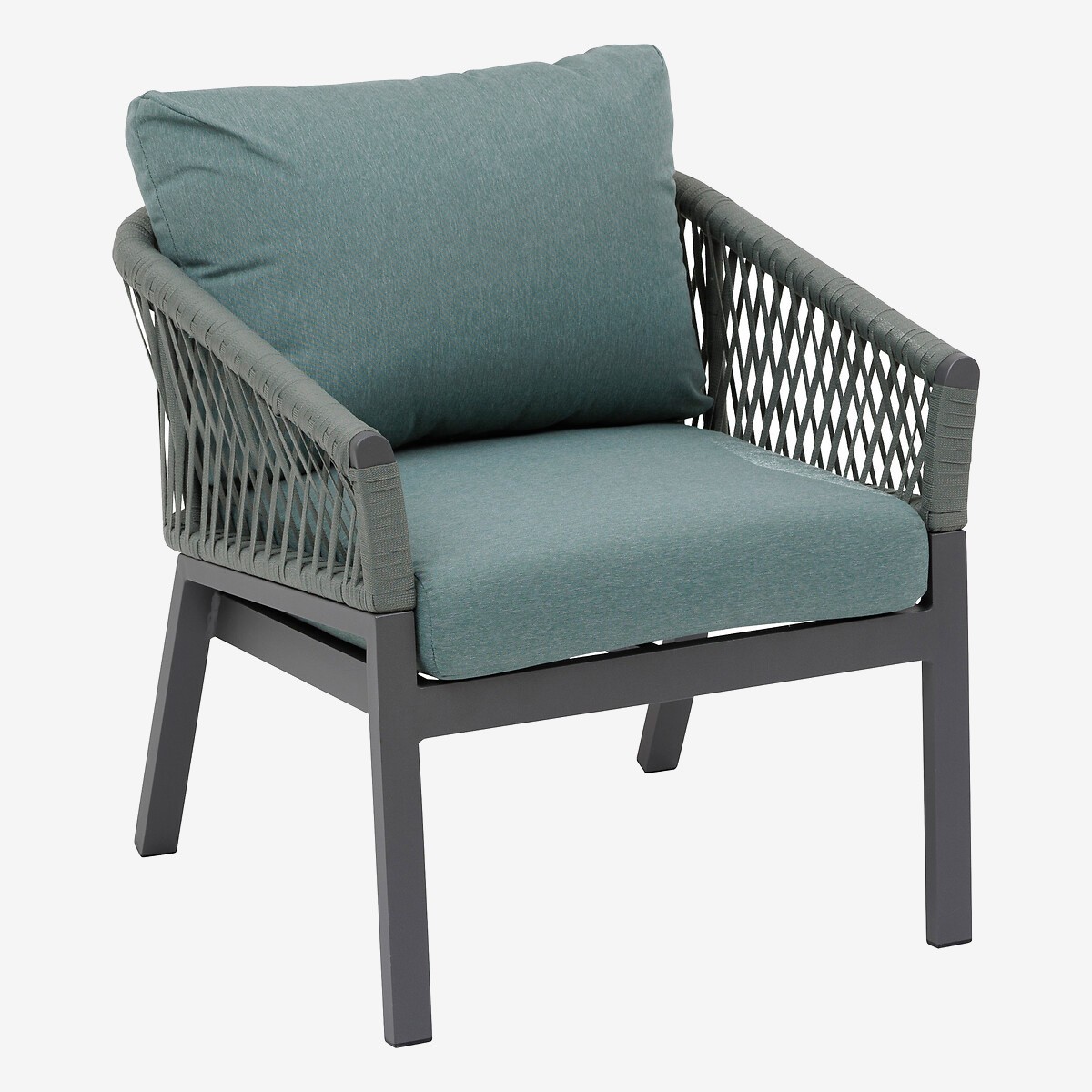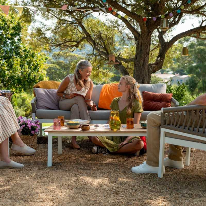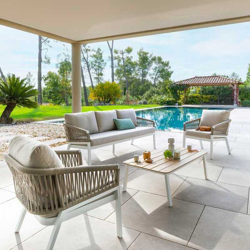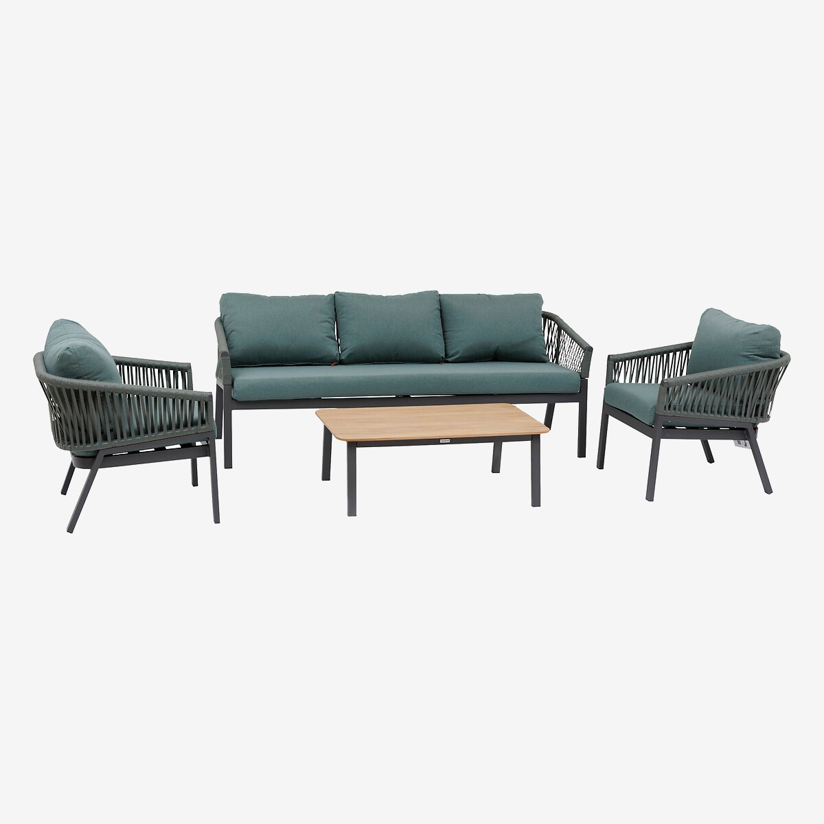Salon de jardin ORIENGO, structure en aluminium traité epoxy. Plateau de la table en acacia. Coussins en polyester 230g/m2 déhoussables