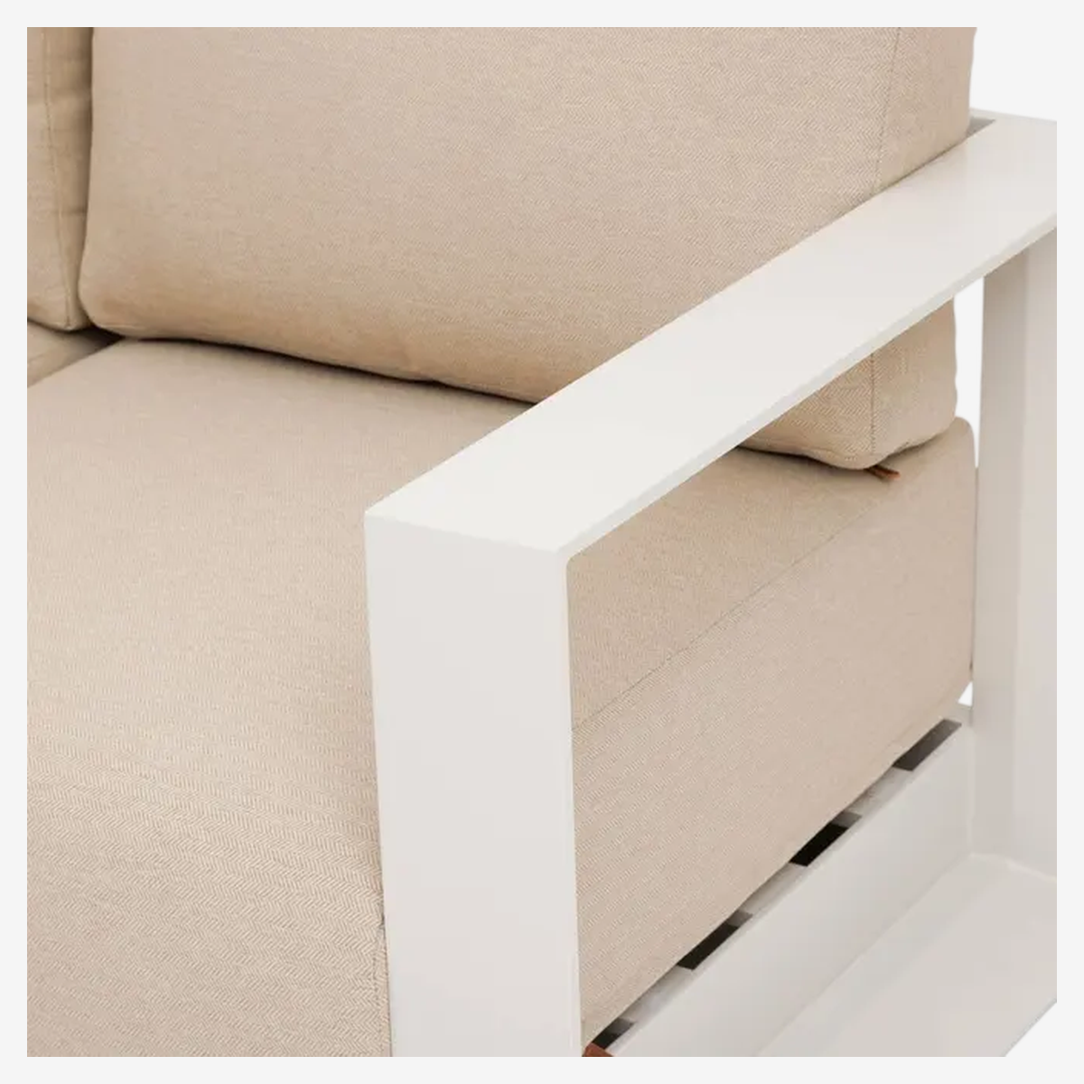 Le salon Allure est équipé de coussins d’assise et de dossier en tissu déperlant, déhoussables et lavables, pour un usage quotidien plus pratique. Sa structure traitée époxy résiste à l’humidité et à la décoloration, et son entretien se fait simplement à l’aide d’une éponge savonneuse.
