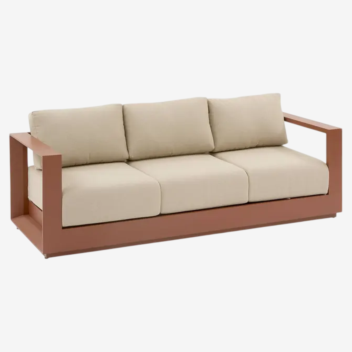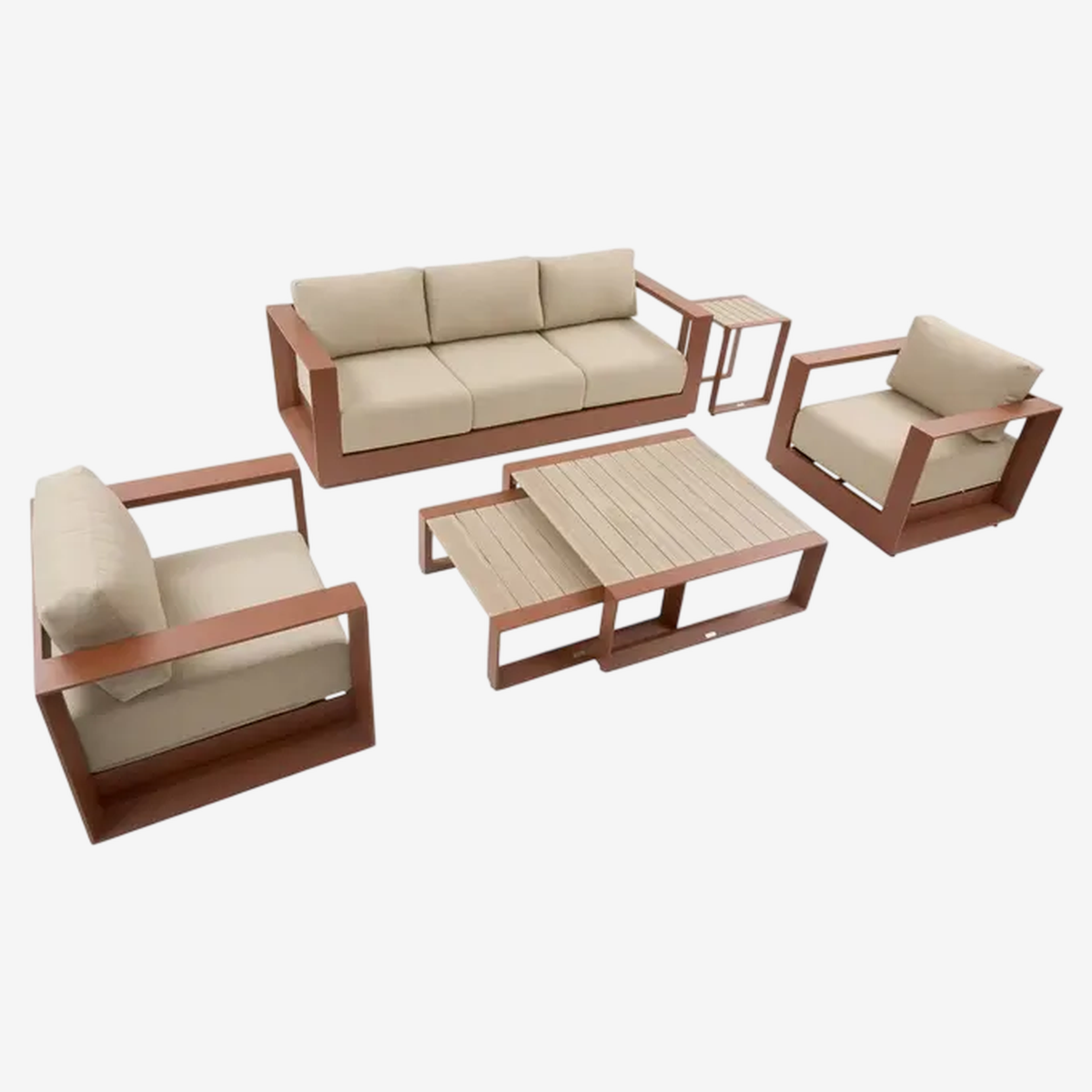 Ce salon de jardin comprend un canapé 3 places, deux fauteuils, un lot de tables basses gigognes et une table d’appoint. Les tables permettent de moduler facilement l’agencement selon les besoins, tandis que les accoudoirs larges participent au confort d’utilisation au quotidien.