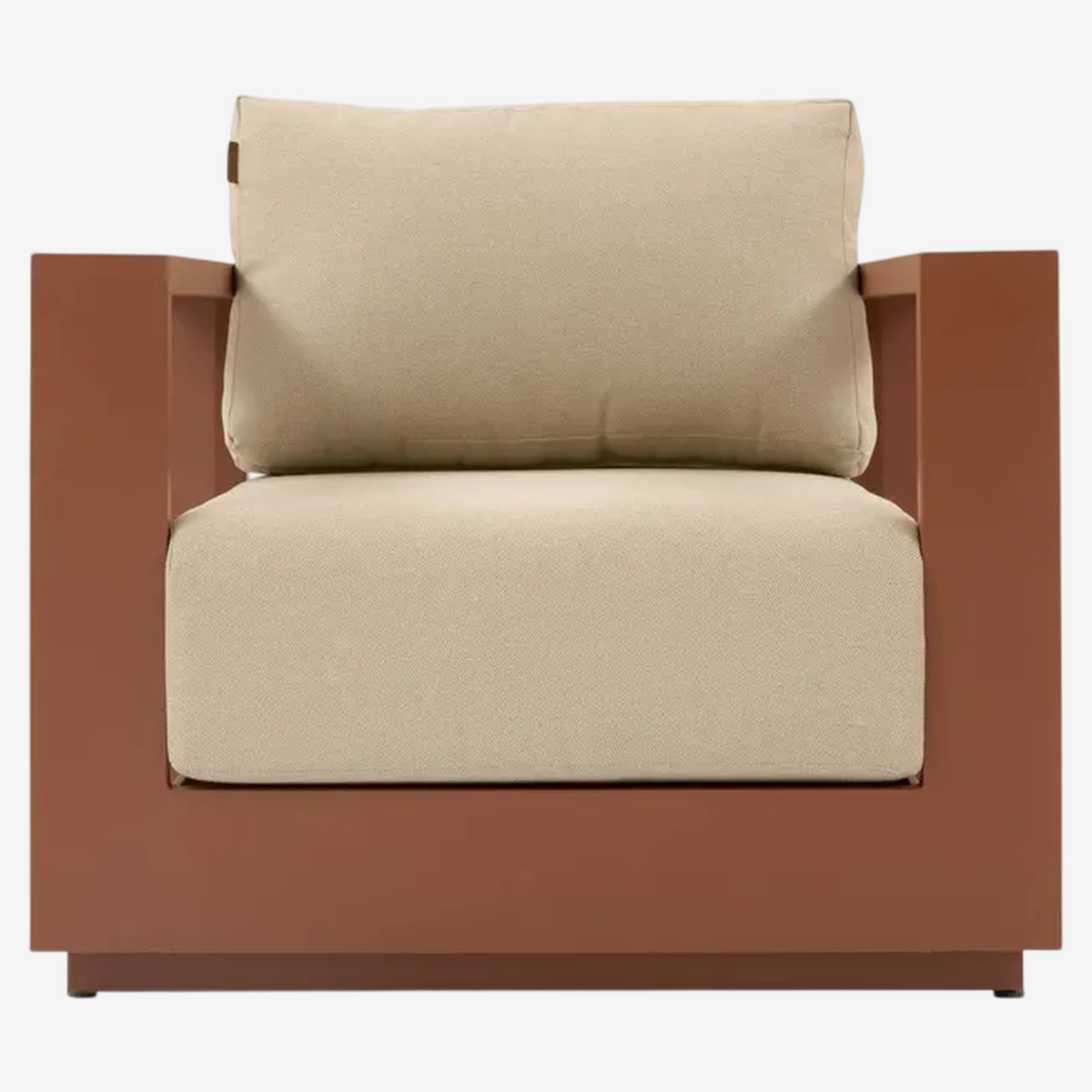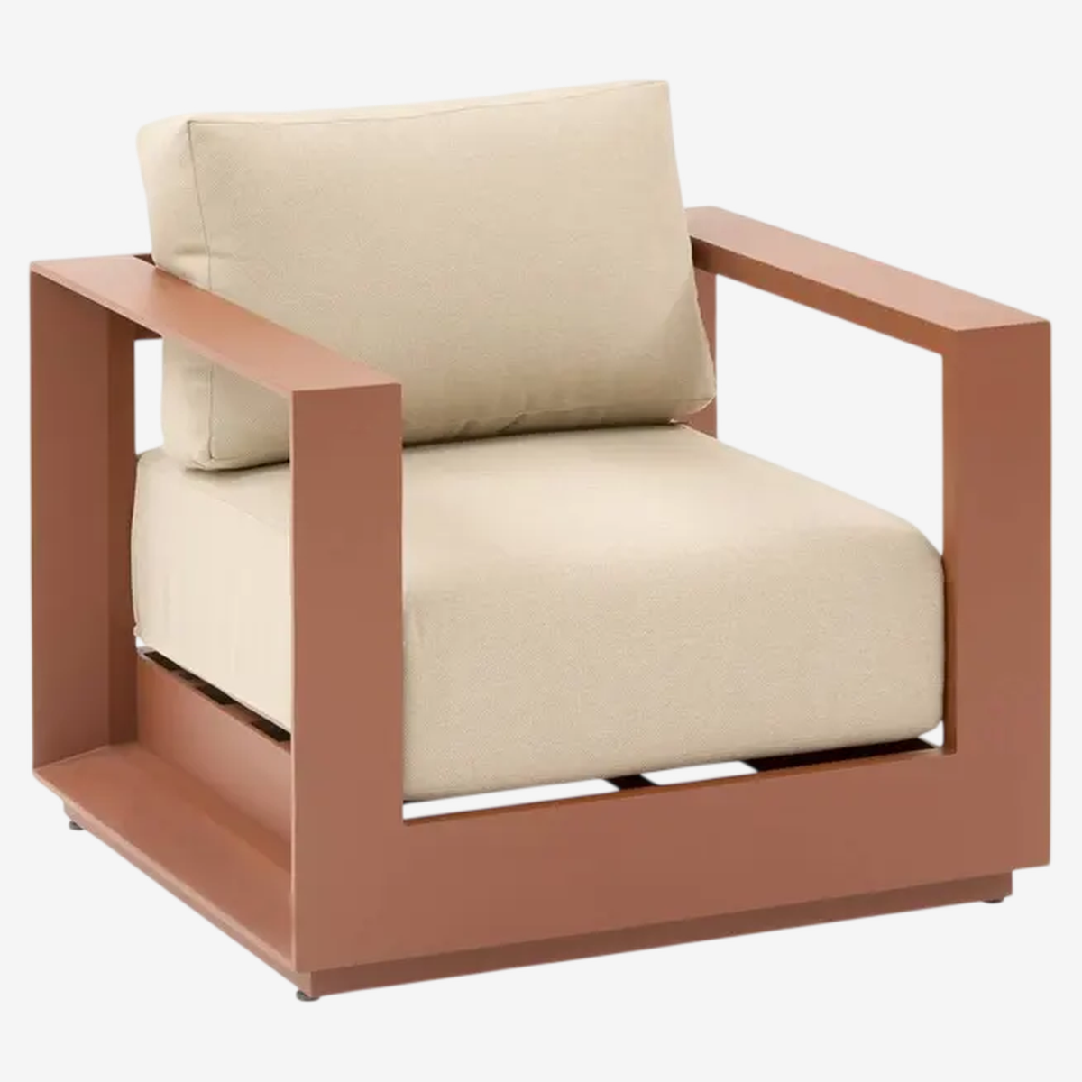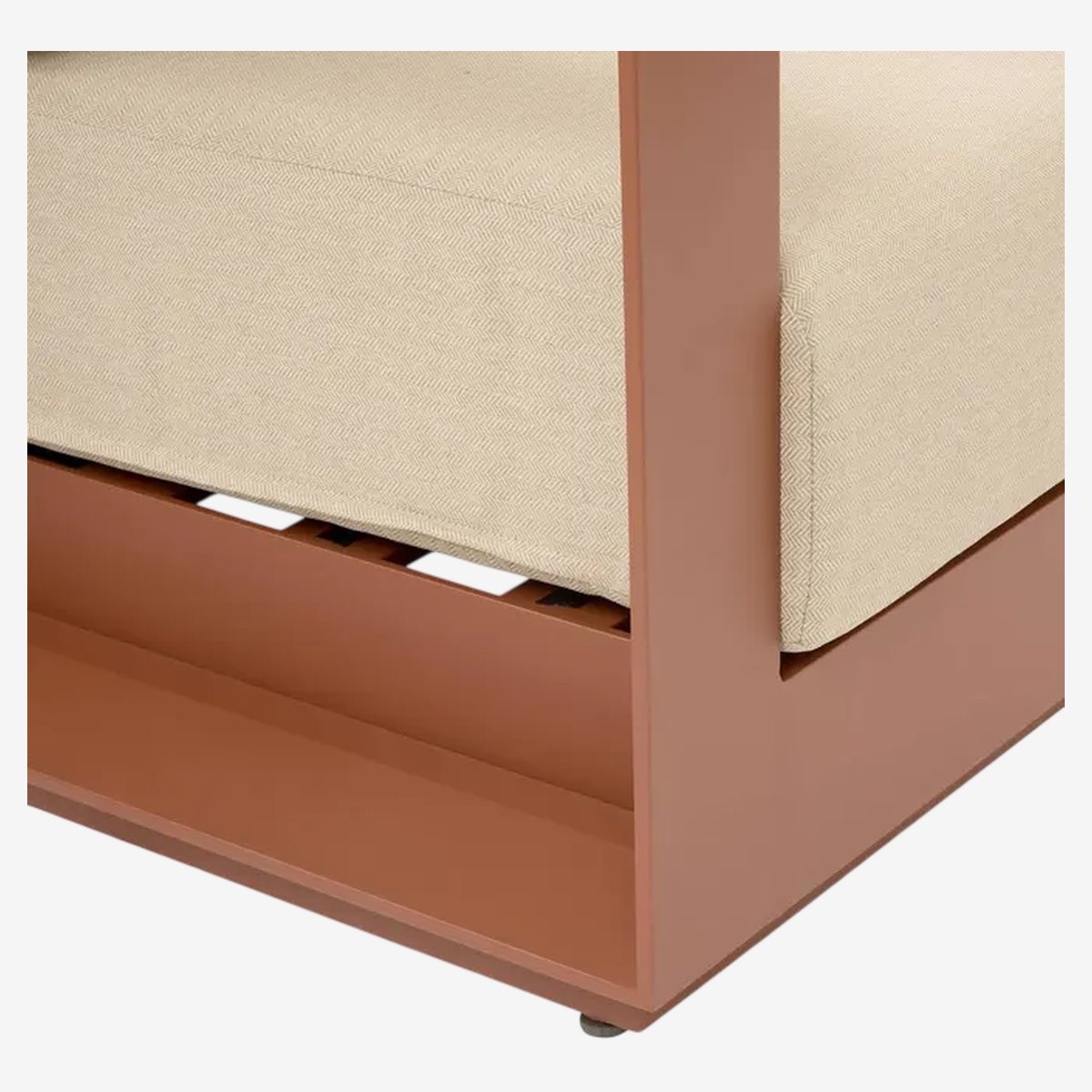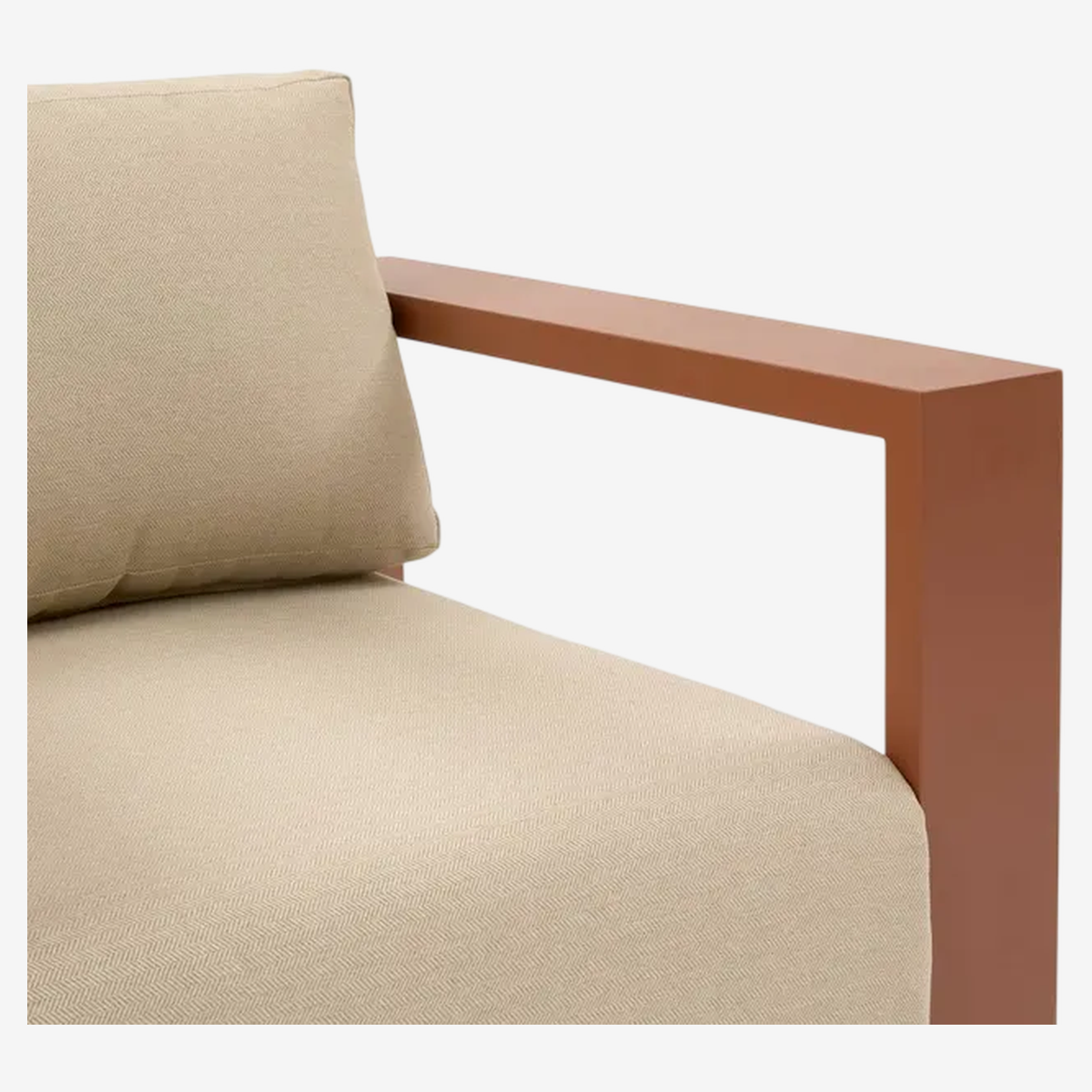 La structure en aluminium bénéficie d’un traitement époxy qui la protège de la rouille. Les pieds ajustables assurent une bonne stabilité sur différents types de sols. Les coussins en polyester texturé avec traitement déperlant laissent glisser l’eau et sont conçus pour simplifier l’entretien.