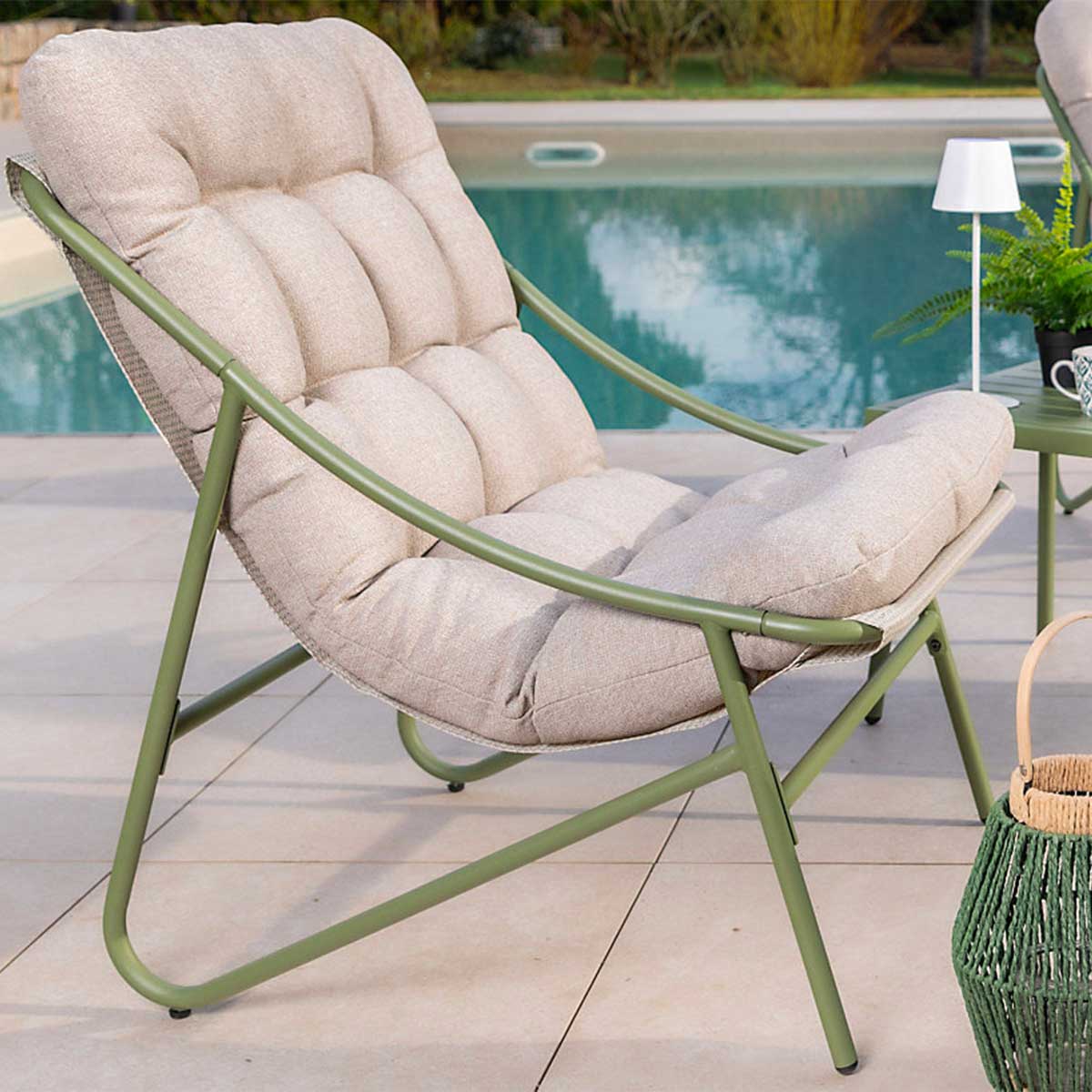 Sa structure en acier inoxydable est conçue pour résister à la corrosion et aux usages extérieurs réguliers. Son coloris vert sauge apporte une note douce et contemporaine, facile à intégrer dans différents styles d’ambiance extérieure.