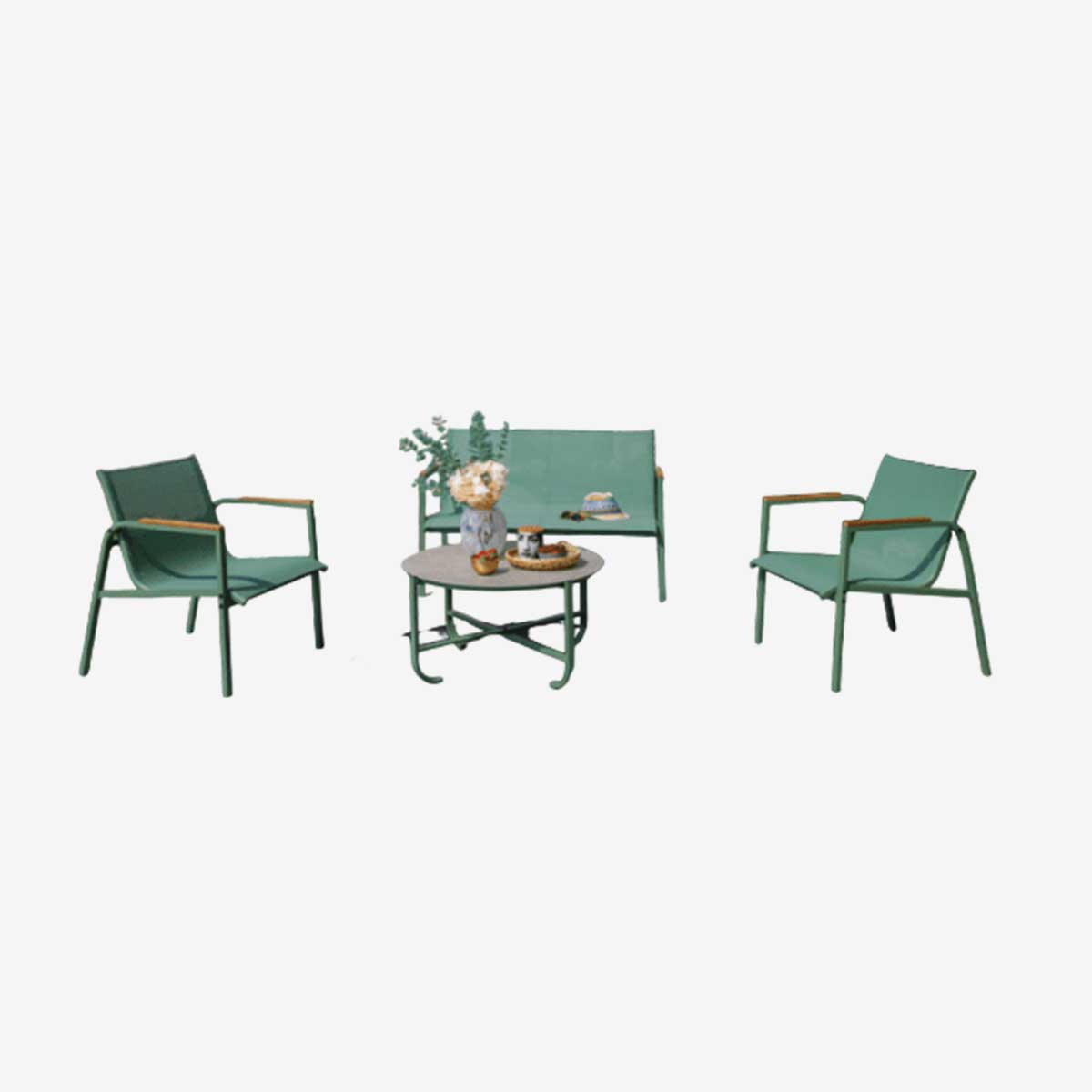 Avec son coloris vert et ses accoudoirs ornés de baguettes en polywood effet bois, le salon PERTH apporte une touche chaleureuse et contemporaine à vos extérieurs. L’association du métal, du verre et de l’effet bois crée un bel équilibre entre modernité et esprit naturel.