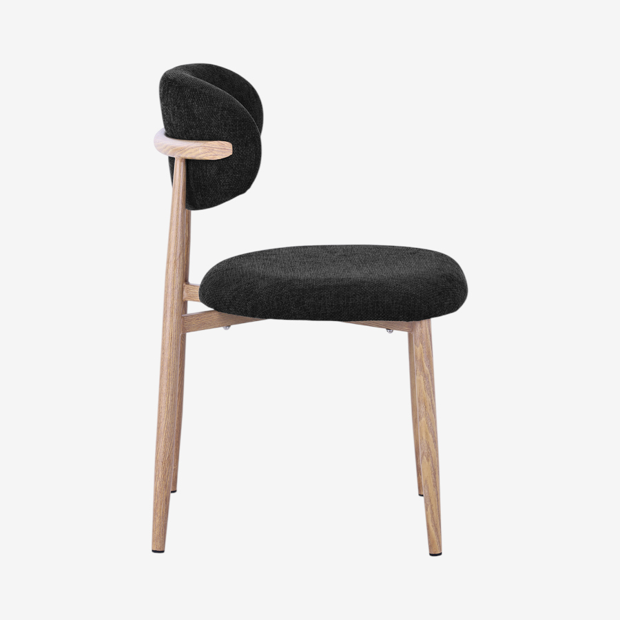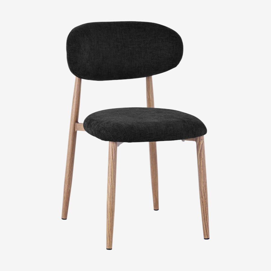 | Composition | Structure : métal avec finition effet bois naturel - Revêtement : tissu 100 % polyester résistant à l’usure - Assise : mousse haute densité pour un confort durable - Hauteur d’assise : env. 48 cm - Design : inspiration nordique, lignes douces et modernes - Utilisation : salle à manger, bureau, coin repas ou salon |