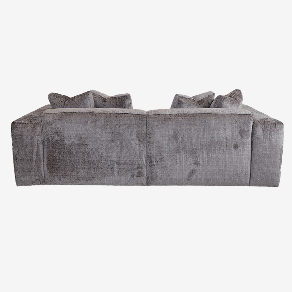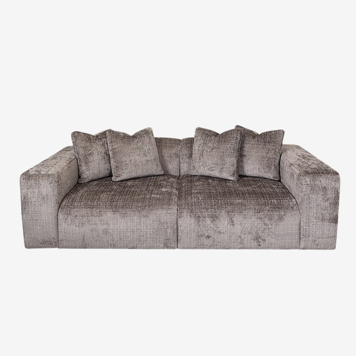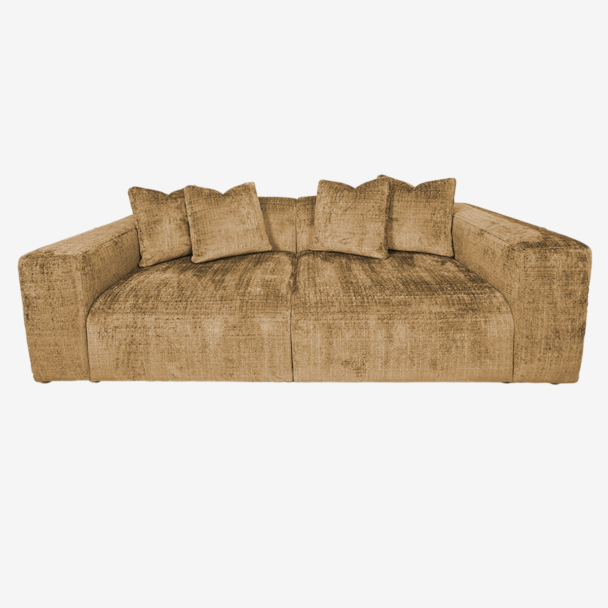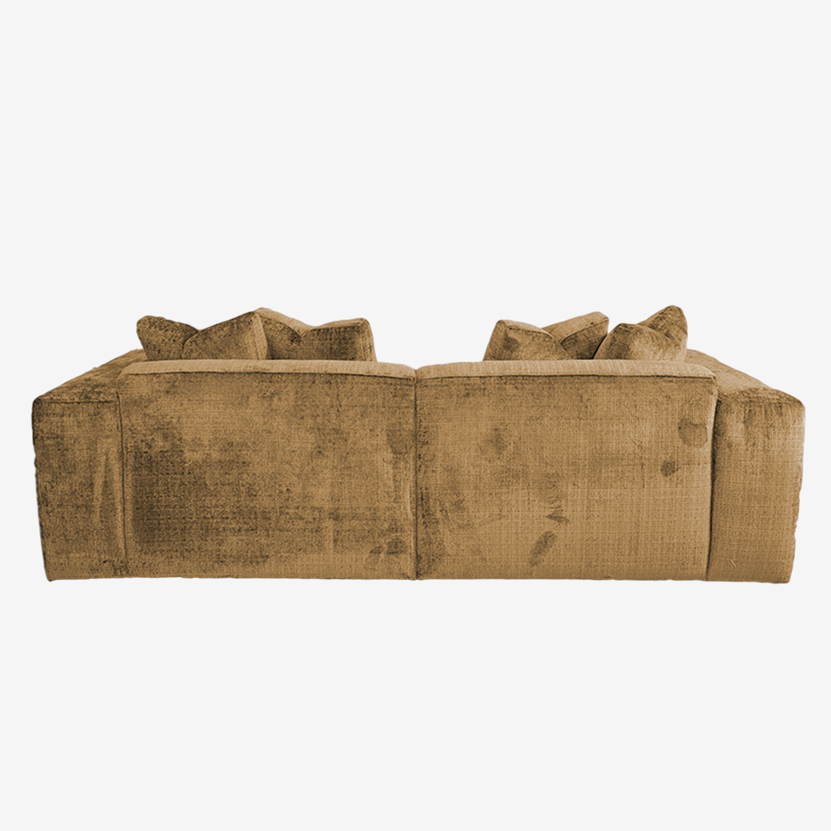 L’assise repose sur des sangles et des ressorts zig zag, avec des coussins en mousse haute résilience HR3037 de 8 cm, complétés par une mousse T2837 de 5 cm et 2 couches de ouate polyester 200 g/m². Le dos en tissu polyester intègre une mousse haute résilience HR3037 de 8 cm et 2 couches de ouate polyester 200 g/m². Les pieds en polypropylène et les coussins de décoration déhoussables viennent compléter l’ensemble.