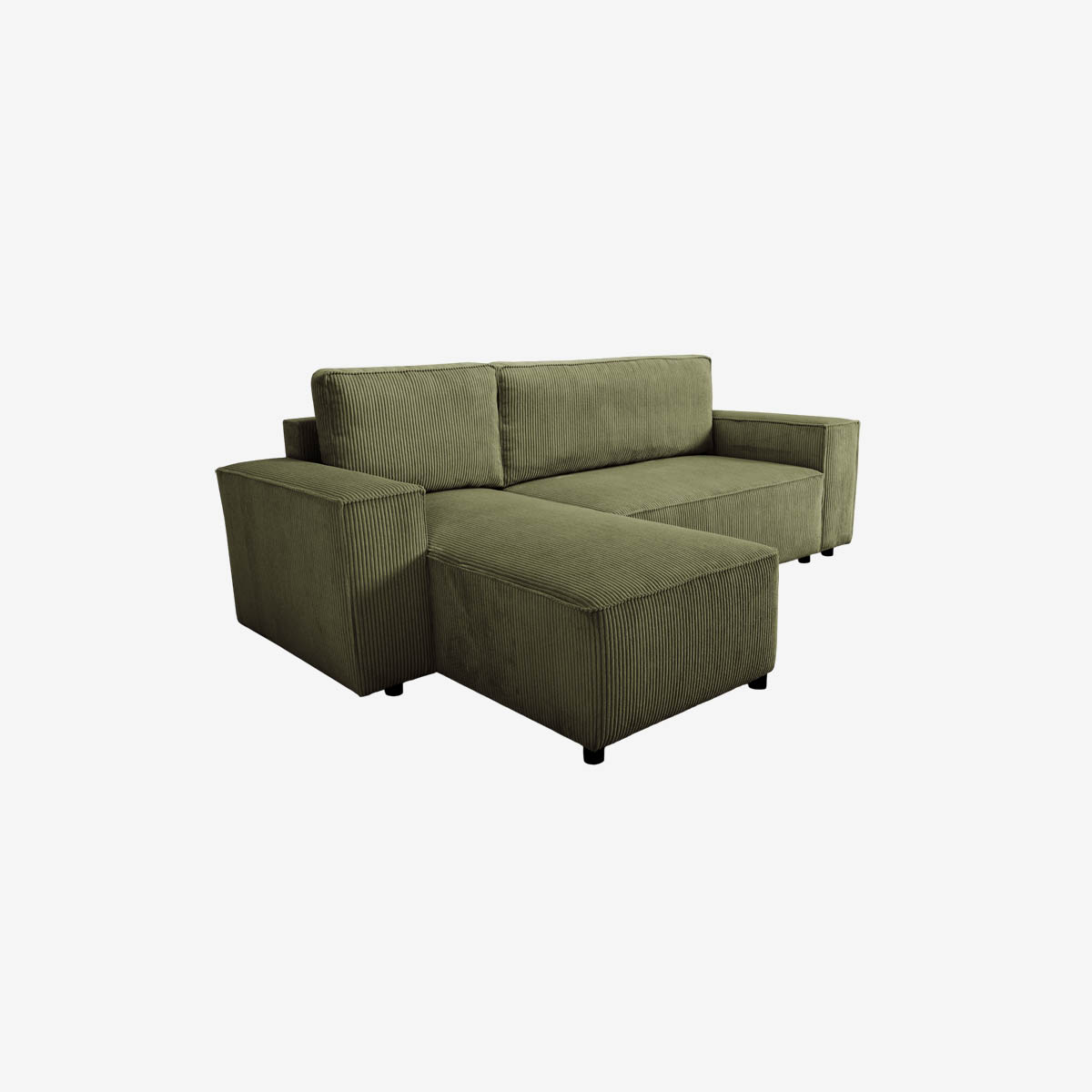 Composition | CANAPÉ D'ANGLE CONVERTIBLE RÉVERSIBLE, COUCHAGE DIRECT AVEC ÉPAISSEUR DE 70 MM - GARNISSAGE EN MOUSSE POLYURÉTHANE (PU) DENSITÉ 25 KG/M³ + OUATE 240 G/M² - COFFRE DE RANGEMENT DE 85 L - PIEDS EN PLASTIQUE NOIR. |