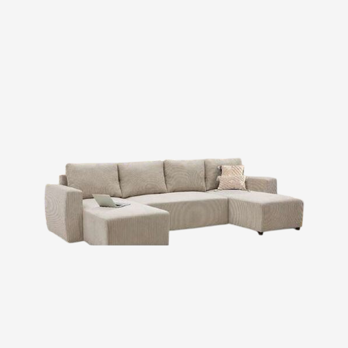 PANDORA - CANAPÉ D'ANGLE PANORAMIQUE CONVERTIBLE, RÉVERSIBLE, AVEC COFFRE. REVÊTEMENT EN TISSU VELOURS CÔTELÉ COULEUR PERLE, 100 % POLYESTER. COFFRE DE RANGEMENT DE 80 L. COUCHAGE DIRECT AVEC ÉPAISSEUR DE 70 MM. DENSITÉ DE MOUSSE 25 KG/M³ + OUATE 120 G/M². PIEDS EN PLASTIQUE NOIR.