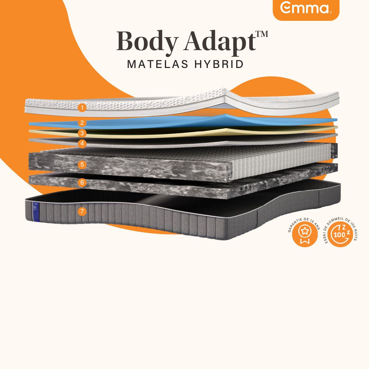 Le matelas EMMA BODY ADAPT HYBRID est pensé pour celles et ceux qui recherchent une sensation équilibrée : ni trop ferme, ni trop moelleuse. Sa structure hybride combine des mousses de confort et un cœur de ressorts ensachés, pour un soutien plus dynamique et une bonne stabilité sur toute la surface.