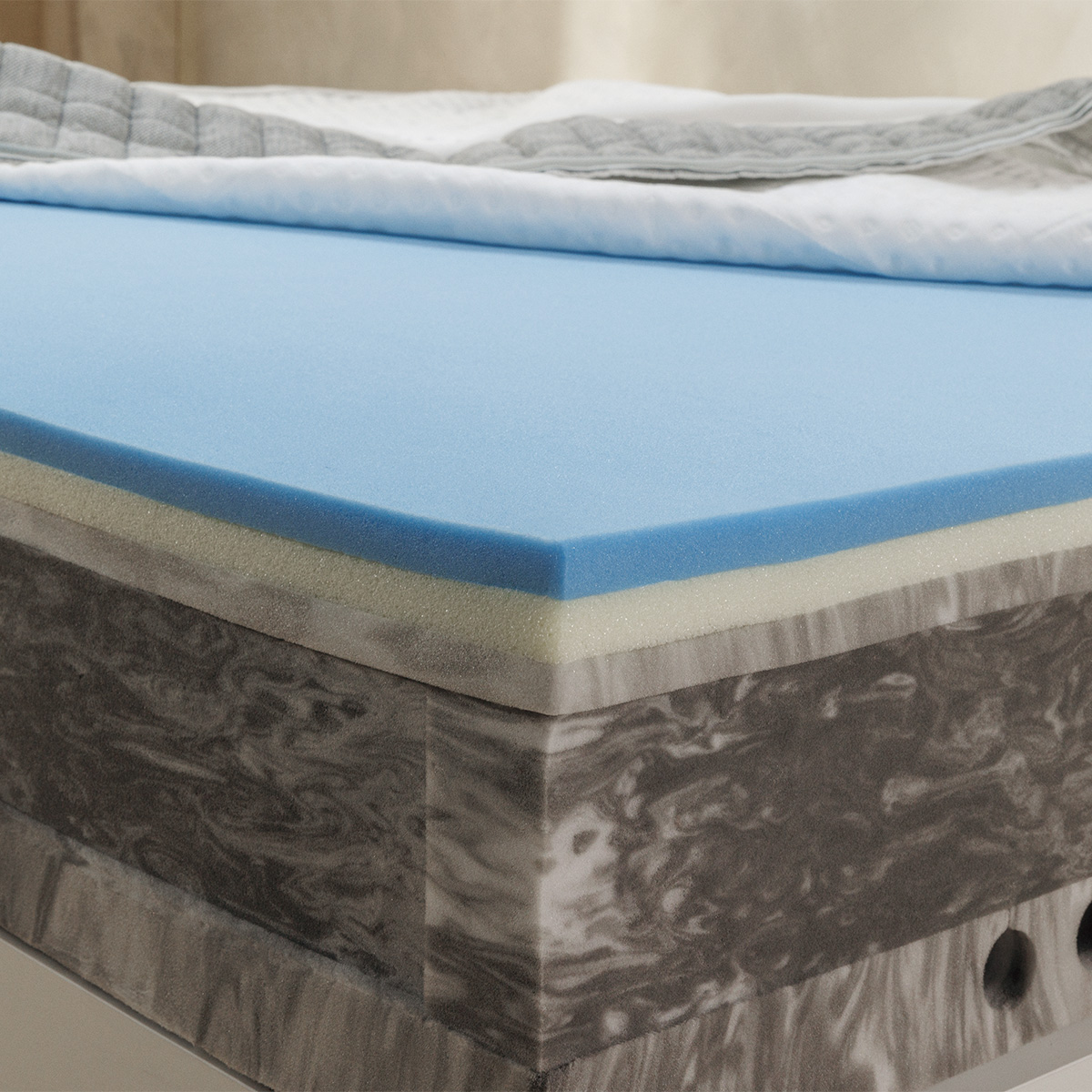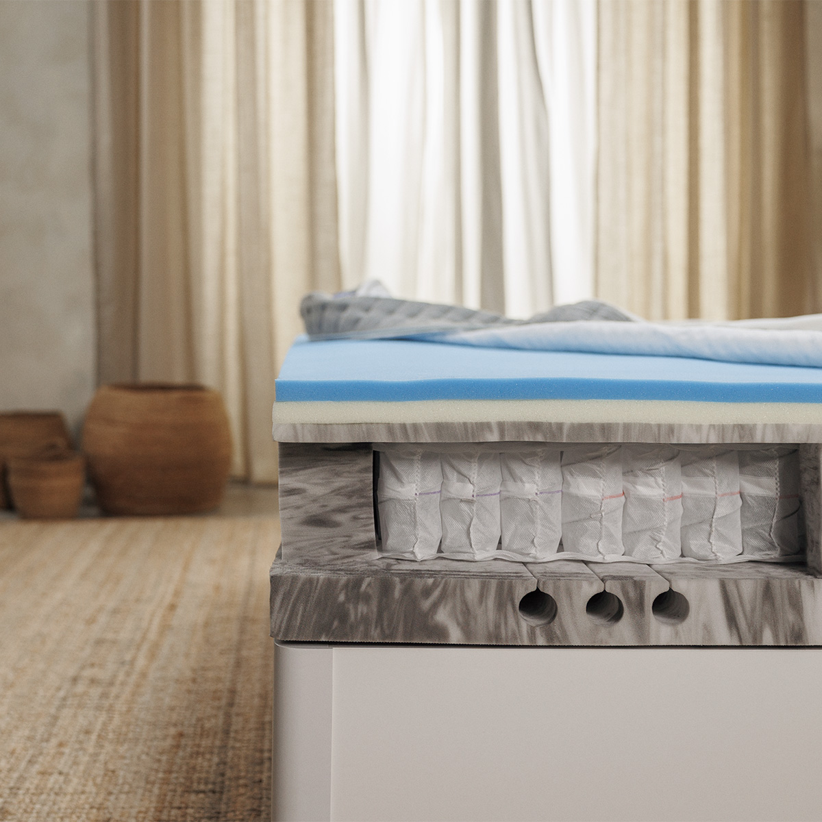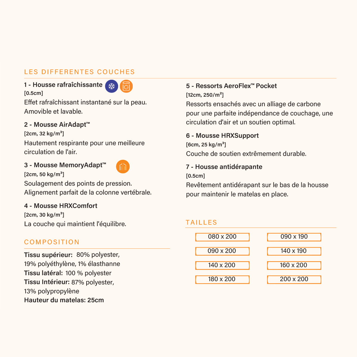 Les couches AirAdapt™ et MemoryAdapt™ apportent un confort progressif et une adaptation agréable, tandis que les ressorts ensachés AeroFlex™ participent à un meilleur maintien. Le tout est complété par des mousses HRXComfort et HRXSupport pour renforcer la base. Sa housse rafraîchissante et anti-dérapante ajoute un vrai plus à l’usage, avec des poignées pour faciliter la manipulation.